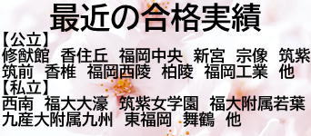 | 高校受験 | 西南高校、大濠高校[特進]、筑陽高校[特進S]、若葉高校、城南高校、春日高校、筑紫中央高校、福岡中央高校、筑前高校、新宮高校、香椎高校、福翔高校、西陵高校、福岡工業高校 他 |