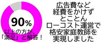 シンプルに「格安家庭教師」がオススメな理由 ダイエットと同じで、どんなに便利な教材やツールがあっても、ひとりで続けるのは難しいものです。だからこそ、わかるまで何度でも教えてくれて、一緒に練習してくれる先生の存在が大切です。私たちの家庭教師は、他社の料金で2〜3倍の個別指導が可能。格安でも、指導の質と量には一切妥協しません。「わかった!」「できた!」という確かな手ごたえを何度も積み重ねることで、自然と勉強への自信とモチベーションが育ちます。実際に成績アップ率は90%以上。データがなくても、その効果はきっと想像しやすいはずです。 |